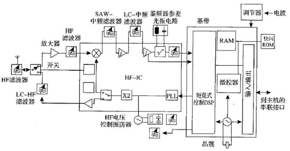 圖2全套單芯片方案全部采用CMOS技術生產(chǎn)。每個芯片包含基帶DSP,高頻部分和全集成單元的多用途16bitAISC處理器。這種受到保護的“芯片中的高頻"體系結構有明顯的優(yōu)點,并遠遠超過減少分立元件數(shù)量的的優(yōu)點。它的技術和經(jīng)濟優(yōu)點主要有四方面:①電壓控制振蕩器;②中頻接收機;圖天線和發(fā)射機/接收機之間的高頻前端;④集成和生產(chǎn);