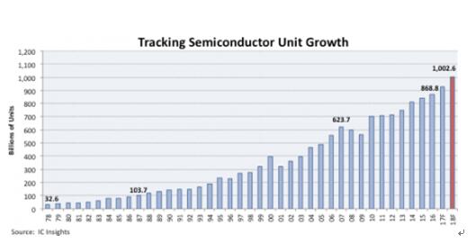 依據調研機構IC Insights的統計,2016年全球半導體出貨量為8688億顆。IC Insights預測,2018年半導體出貨量將達10026億顆,而1978年全球出貨量只有326億顆,按照這樣算下來,在過去四十年間半導體的平均年增長率為8.9%,萬億顆年出貨量也呈現了如今全世界離不開半導體的狀態。