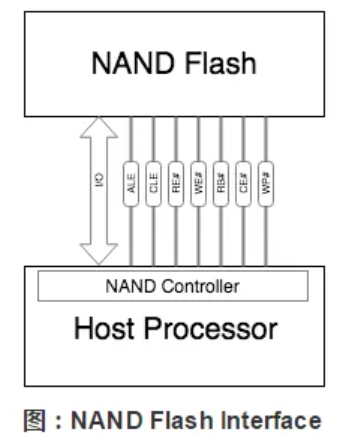 NAND FLASH需要通過專門的NFI(NAND FLASH Interface)與Host端進行通信,如下圖所示: