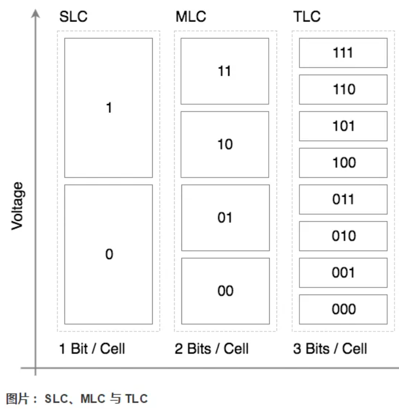 NAND FLASH的一個存儲單元內部,是通過不同的電壓等級,來表示其所存儲的信息的。在SLC中,存儲單元的電壓被分為兩個等級,分別表示0和1兩個狀態,即1個比特。在MLC中,存儲單元的電壓則被分為4個等級,分別表示00011011四個狀態,即2個比特位。同理,在TLC中,存儲單元的電壓被分為8個等級,存儲3個比特信息。