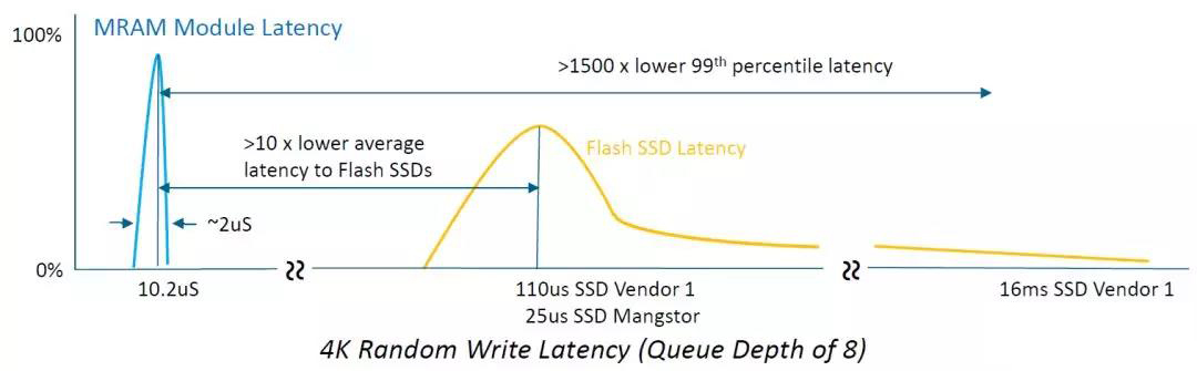 Everspin科技公司目前是全球第一家提供MRAM存儲(chǔ)芯片產(chǎn)品,目前推出最新款的產(chǎn)品STT-MRAM產(chǎn)品,單顆芯片容量可達(dá)32MB,可以做SSD固態(tài)硬盤的緩存綽綽有余,如下圖,MRAM的讀寫延遲只有10微秒左右,而且在命令很多的情況下,延遲QoS非常穩(wěn)定,波動(dòng)在2微秒之內(nèi)。而SSD的延遲在100微秒,同時(shí)命令多了之后,延遲更長(zhǎng)。