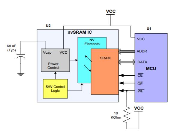 賽普拉斯的NV-SRAM將標(biāo)準(zhǔn)快速SRAM單元(訪問時間高達(dá)20 ns)與基于硅氧化物和亞硝酸鹽,氧化物硅(SONOS)的非易失性存儲元件相結(jié)合,可提供快速的異步讀寫訪問速度,并在其整個工作范圍內(nèi)具有20年的數(shù)據(jù)保留。具有控制器的典型